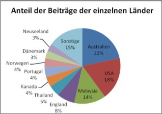 Mehr als 20 verschiedene Nationen nahmen in diesem Jahr an dem Workshop teil. Abbildung 1 zeigt die Verteilung der mehr als 180 Beiträge auf die teilnehmenden Länder. Australien, die USA und Malaysia waren die Länder mit den meisten Beiträgen. Aus europäischer Perspektive zeigten Wissenschaftlerinnen und Wissenschaftler aus England, Portugal, Norwegen und Dänemark das größte Engagement, wie die Auswertung der im Internet frei zugänglichen Abstracts ergibt. Ein Beitrag aus Deutschland findet sich nicht darunter. Eröffnet wurde die Veranstaltung von Professor Bryony Dean Franklin, klinische Pharmazeutin und Direktorin des „Centre for Medicines Safety and Service Quality“ in England. Die Patientensicherheit und die Zusammenarbeit zwischen Patient und Apotheker standen im Mittelpunkt ihres Vortrags.